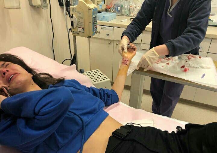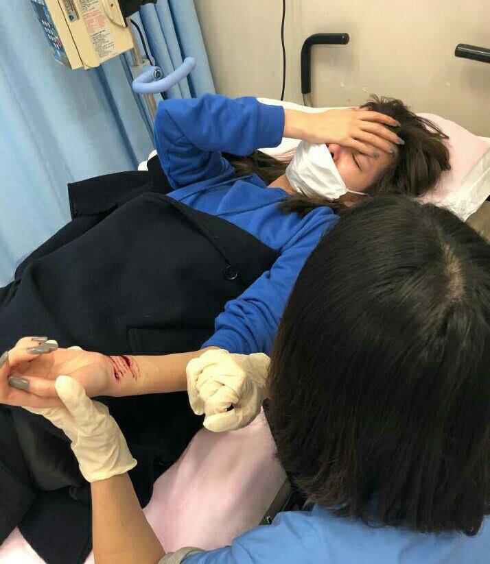 从图中可以看到,康雅馨在医院接受治疗,表情十分痛苦的躺在病床上接受医生治疗,双眼鼻尖泛红,隔着屏幕都感受到康雅馨的哭腔了。康雅馨戴着白色口罩休息,手捂着额头似乎有些累的样子。康雅馨手腕上的伤口鲜血淋漓,有几道吓人的刀痕,看得出来康雅馨割腕的时候情绪非常不好,所以才会不怕疼的做出连割几条伤痕的自杀行为。