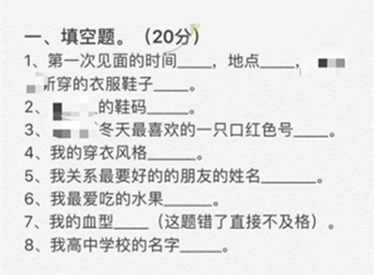 第一道大题是填空题,内容基本是一些对对方的基本了解,比如:第一次见面的时间是什么时候,第一次见面的地方是在哪里?我的鞋码是多少?我喜欢什么口红色号?我的穿衣风格是怎样的?我最好的朋友是谁?我最爱吃的水果是什么?我的高中学校的名字是什么?我的血型是什么?并且血型这道题后面标注“这道题答错了不及格”。这些情侣之间必须得知道,如果这些都答不来,那么只能是分手了!