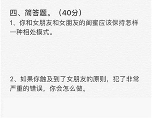 第四大题是一道简答题,简答题比填空题按理说是难一些,不过这两道简答题却是送分的,因为问题是非常简单,但是有点情商的男生都会回到出来满分。第一道简答题是问男生应该怎样和女友的闺蜜相处?这个应该不难!第二道简单题是问男生如果触及到了女友的原则,犯了严重的错误,男友应该怎么做?这个问题的回答更是简单。