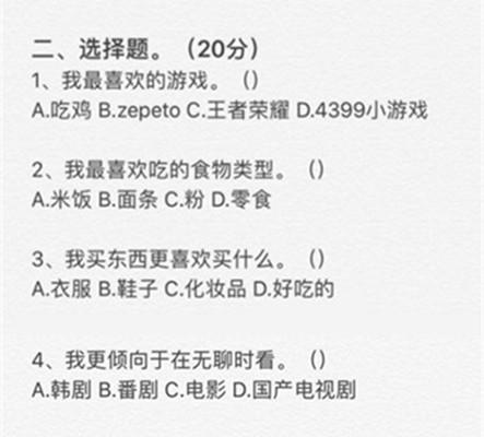 第二道大题是选择题,一般选择题是比填空题更为容易,因为已经给出了选择答案,四选一,不用自己空想了。这位女朋友给出了四道选择题,第一道是问男友她最喜欢玩的游戏是什么游戏,第二道是问男友她最喜欢吃的食物是什么类型的,第三道是问男友她购物时候最喜欢买什么,第四道是问男友她无聊时候喜欢煲什么剧!这些选择题也是非常简单的,只要平常多注意一下对方,这四个问题简直so easy!