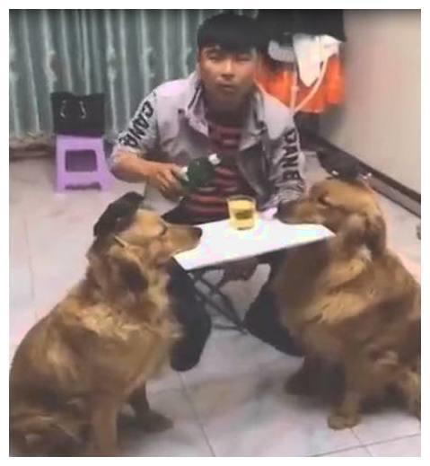 于是男主人趁着女主人不在家,偷偷把两只狗狗弄到客厅里面,然后要狗狗们一边咬着木板的一边,而自己就在这块“桌子”前面畅饮啤酒。本来这个计划天衣无缝,但是还是出了偏差。
