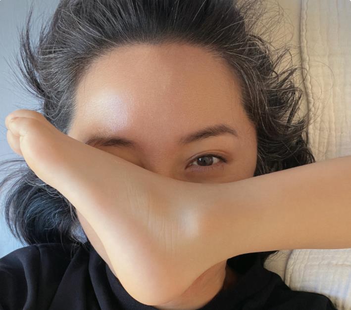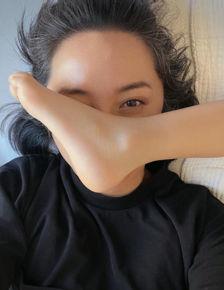 除此之外,还能在照片中看出她的孩子有多调皮了,将自己的脚放在妈妈的脸上,直接就用小脚丫挡住了妈妈半张脸,根据李佳自己的描述,当时的感觉很不适应,鼻子都压瘪了 重量承受不了,独自带娃也是非常的不容易呀,不过尽管如此,还是能看出她已经习惯了孩子的调皮,她非常的平静,尽管比较难受但内心还是毫无波澜。