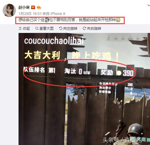 不仅如此,最近因为赵小臭在直播绝地求生时打出0吃鸡的战绩之后,有网友更是调侃她为“苟(狗)的女人。”原来,像赵小臭这类女主播本身在玩绝地求生这种FPS游戏时并没有优势,纯属是为了娱乐,更不要说吃鸡了。因此,当时0杀吃鸡之后的赵小臭也是在微博表示“想给自己买个挂,也不要特别厉害,就是能站起来开枪那种。”如图;