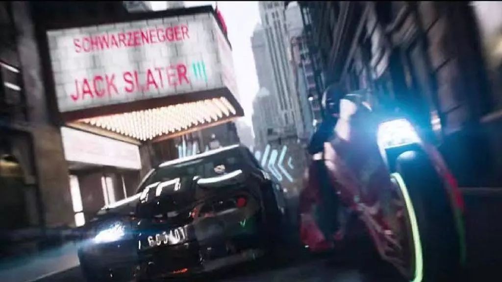 111.《幻影英雄》的主角Jack Slate出现在第一次赛车的车道标语上。