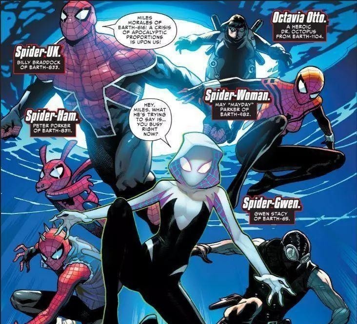 在《蜘蛛宇宙》大事件中,所有平行宇宙的蜘蛛侠不得不团结起来,应对继承者家族通过蜘蛛图腾灭绝狩猎。