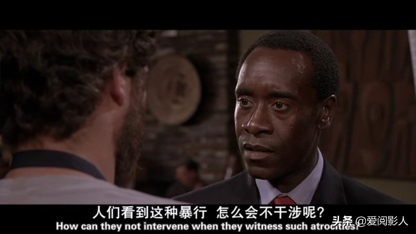 影片里最是令人无可奈何的桥段是白人撤走后,民兵冲入酒店无情冷血的欺辱打骂着蜷缩在角落的无辜者,保罗耗尽最后一丝关系,请求酒店总裁帮助时,总裁的一番言论让人心寒:“卢旺达不会为他们赢得任何一张选票。”