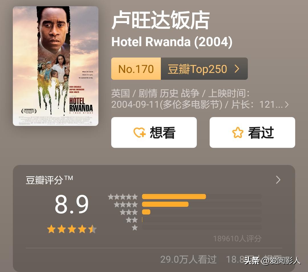 《卢旺达饭店》是2004年上映,根据真实史实改变的战争题材纪录片,电影以1994年发生在卢旺达的种族仇杀,民兵暴动事件为背景,讲述了在这样一块人心惶惶,战火连天的土地上,国际酒店经理人保罗使出浑身解数,最终挽救1268位无辜百姓的感人故事。影片在豆瓣评分8.9,夺得第77届奥斯卡金像奖最佳男主角提名和第62届金球奖最佳剧情片提名。