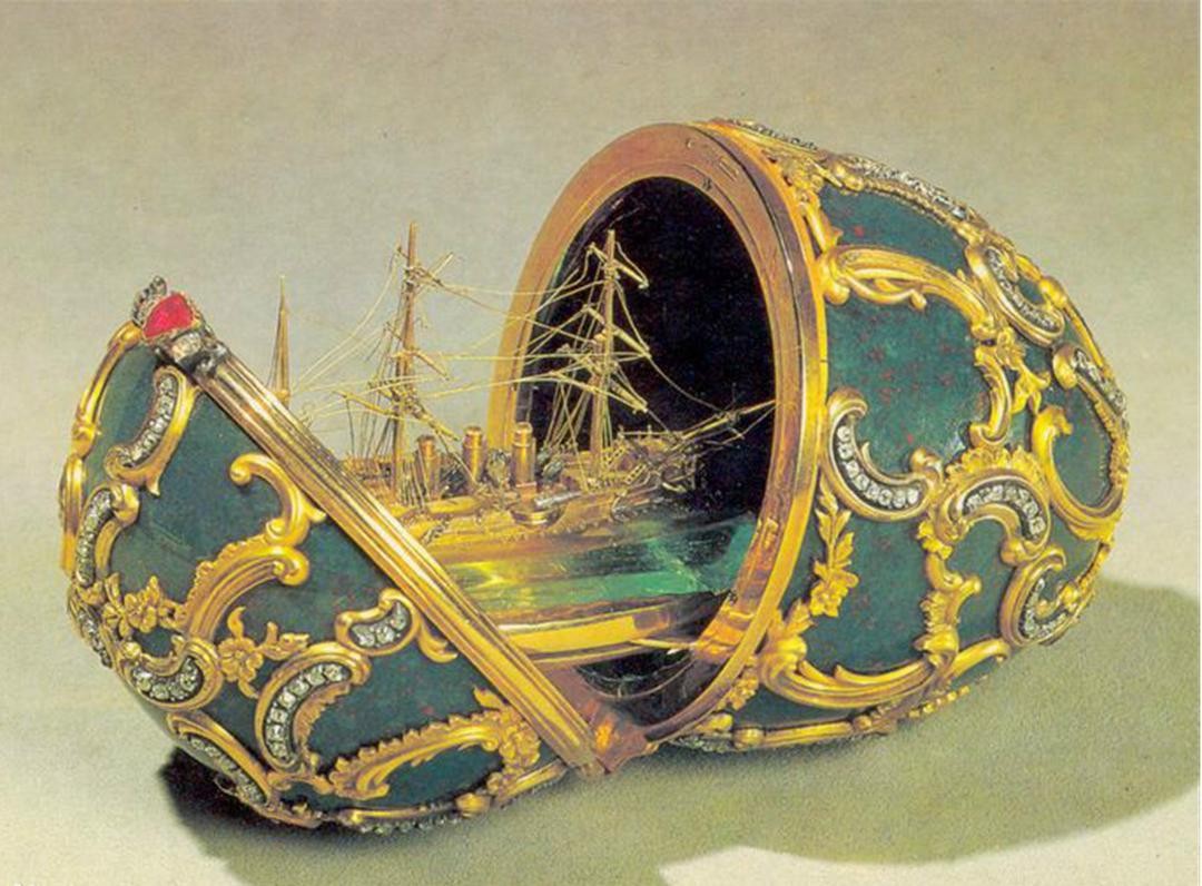 1891年,法贝热制作了一枚名叫“亚速海回忆”的彩蛋,它是和其他彩蛋不同,这枚彩蛋并不是法贝热的创意,它是由沙皇亚历山大订制的,为了纪念1890年亚述号的远东航行。奢华的外壳打开后,你可以看到一个精巧的舰船模型。至此,法贝热彩蛋有了一个新功能,用来纪念沙皇俄国所发生的历史事件,比如1894年的沙皇文艺复兴彩蛋、1900年的跨西伯利亚铁路纪念彩蛋、1912年的拿破仑战争纪念彩蛋等等。