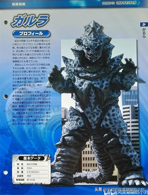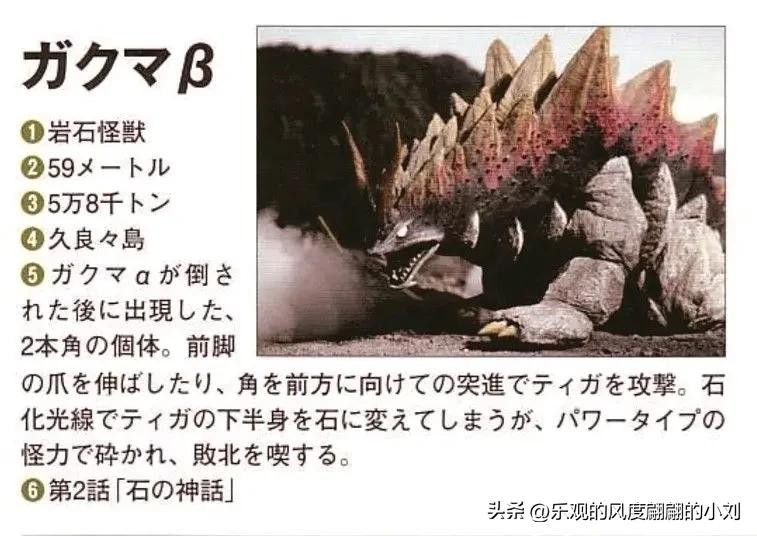 把石头作为食物,由于岛上的石头被人类开挖,导致作为食物的石头不断减少。不断袭击工人,从口中发射石化光线,将人类变成石头然后吃掉。在GUTS的调查中从地底出现,先是被出击胜利飞燕一号击中,而后将飞燕一号撞落,将宗方与丽娜二人逼入绝境,之后被赶来增援的大古、新城和堀井三人驾驶胜利飞燕二号使用新武器「德克萨斯光束」击毙。