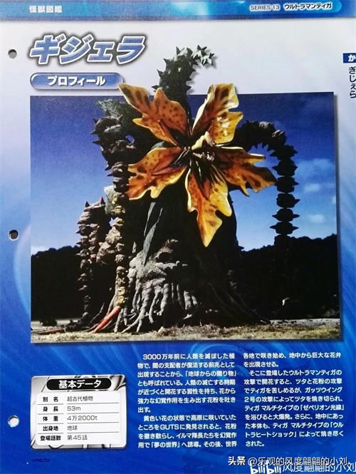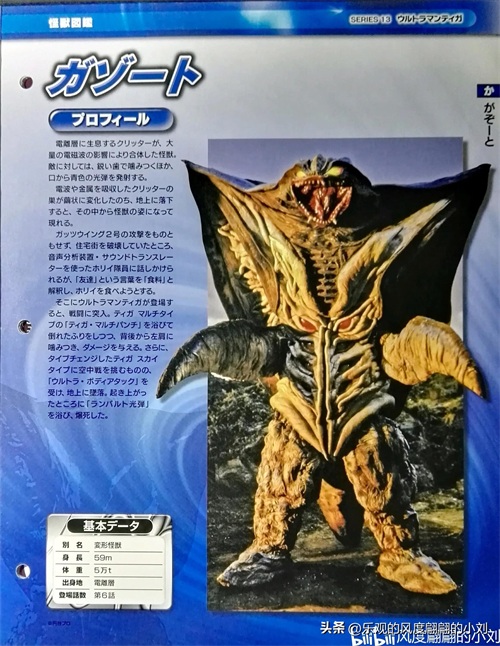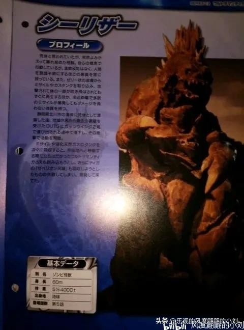 出现于静冈县北川市海岸上的巨大生物尸体,由于尸体腐烂散发强烈恶臭,当地居民要求GUTS立即将尸体烧掉,在丽娜使用胜利飞燕二号进行起吊移动作业时从高空落下并再度复活,开始进行破坏。似乎没有生命反应,对热光感到眩晕,讨厌干燥。身体放出恶臭。能源是液化天然气,为了吸收能源而把储气罐作为目标。能伸长脖子,腹部能吞噬任何能源,口中还能喷出毒气。细胞可以再生,弱点是高温(约1千摄氏度)。