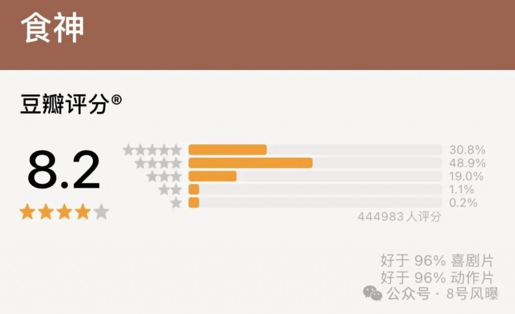 电影《食神》自 1996 年上映至今,在豆瓣累计收到 44 万多人的评价,并获得 8.2 的高分。