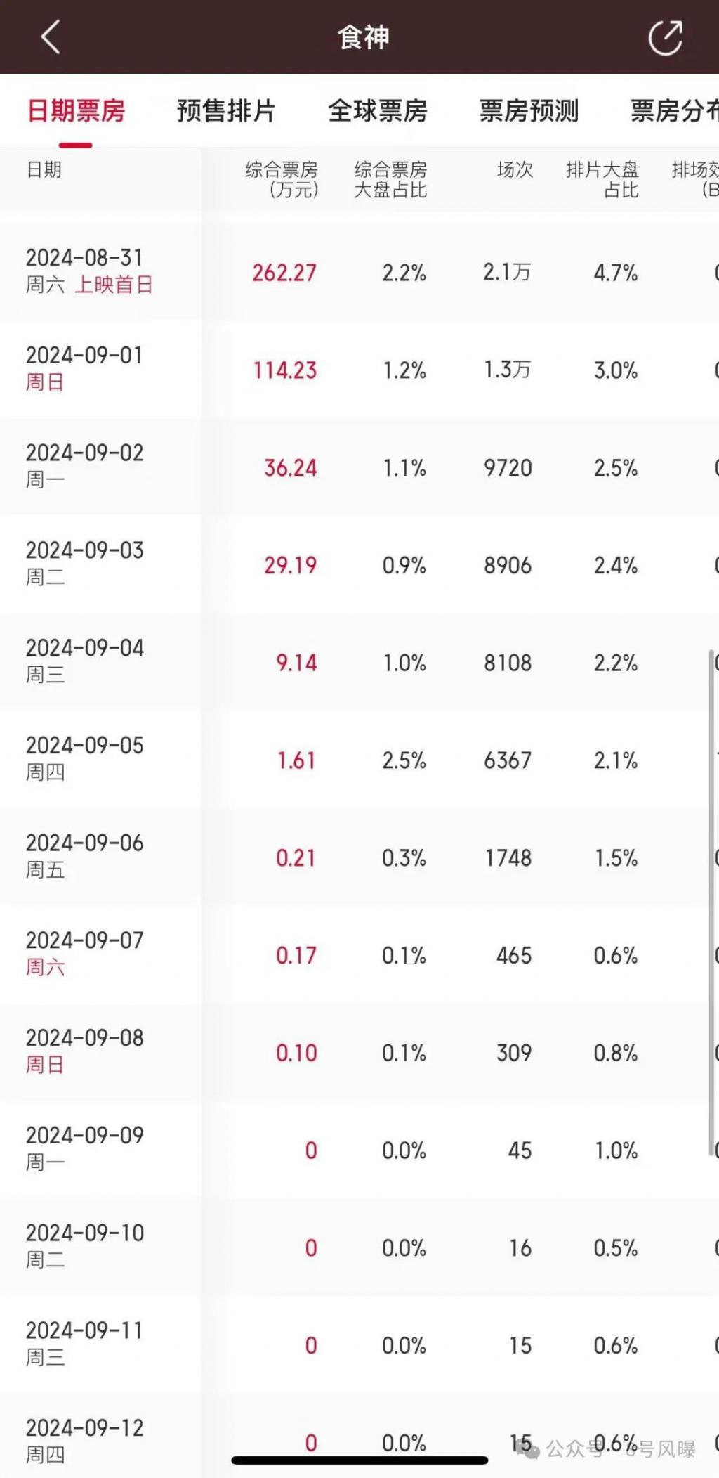 《食神》在市场的这场 " 败仗 " 简短一句总结为:" 首日倒挂,次日拉垮,第三日崩盘。"