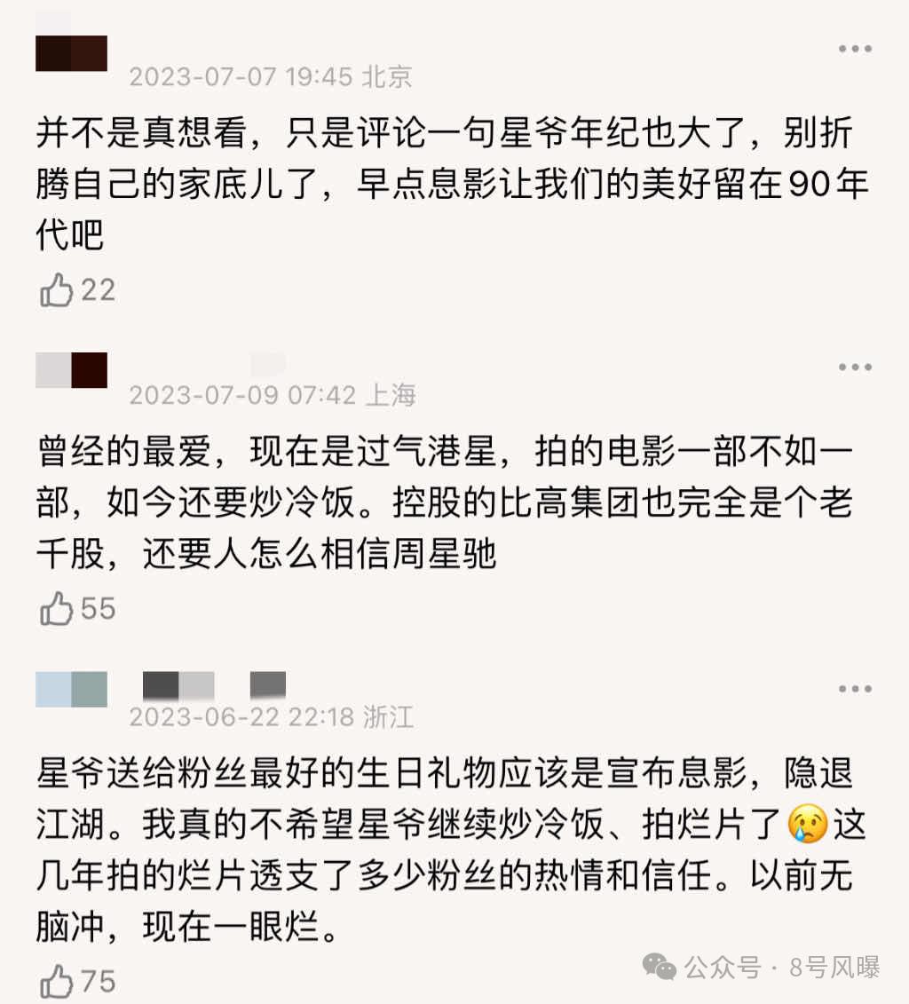 近年来,周星驰名声大不如前,有些网友甚至劝其息影,表示:" 并不是真想看,别折腾自己的家底儿了,早点息影让我们的美好留在 90 年代吧。"