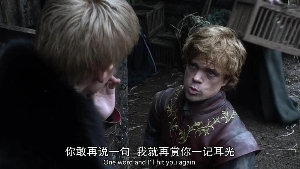 狗窝里醒来的小恶魔,让自己的外甥乔佛里王子对史塔克夫妇献上他自己最为深切的悲痛和歉意,面对傲慢无礼,出言不逊的王子乔佛里连续的三个耳光,观众直呼过瘾,小侏儒这一刻的形象异常高大威猛,连王子的侍卫猎狗都惊呆了,说王子非常记仇,小恶魔毫不在意。接着就去从容,悠闲地去吃早餐了,好像他之前不是在睡在了狗圈里而是像以往那样睡在了尊贵的皇宫里。