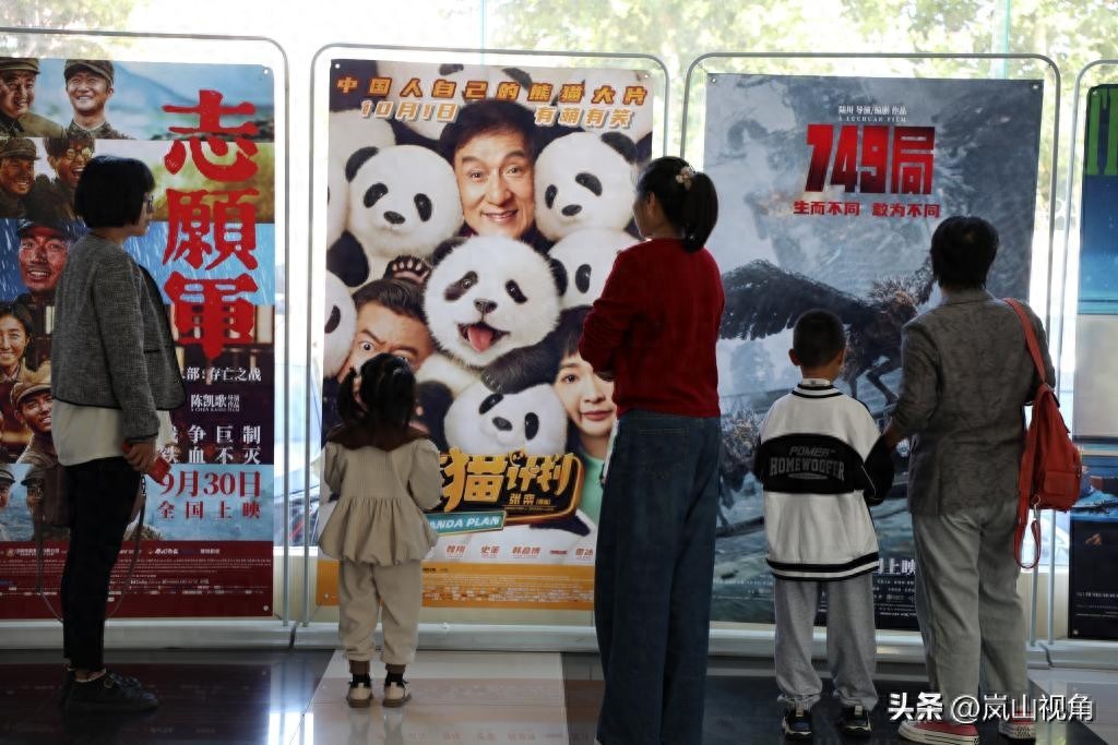 10月7日,观众在山东省博兴县一家影城观看电影海报。新华社发(陈彬摄)
