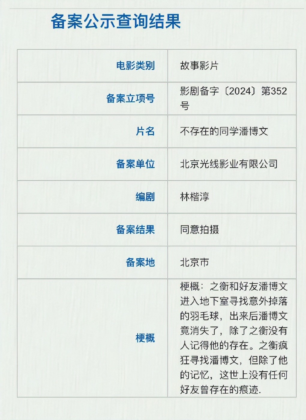 备受关注的电影《不存在的同学潘博文》正式获得备案立项,备案单位为北京光线影业有限公司。该电影的剧情梗概围绕着两位主角之衡和潘博文寻找羽毛球展开,其中潘博文在一次寻找中突然消失,而令人意外的是,没有人记得他的存在。