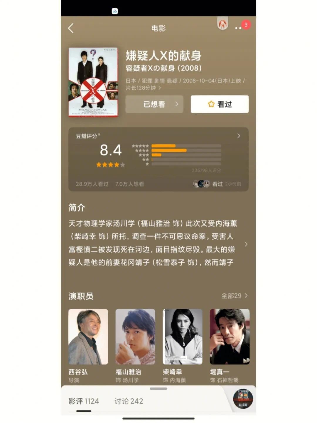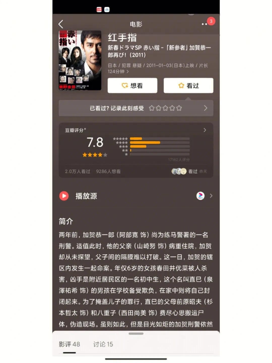 从开始的不解,到最后的震撼,嫌疑人的爱逐渐在眼前变得清晰。已经被翻拍了三个版本,2008年的日本电影是最接近原著,豆瓣评分最高的,结尾最精彩,总有人在你不知道的地方爱着你,并且比你认为的更深更深。
