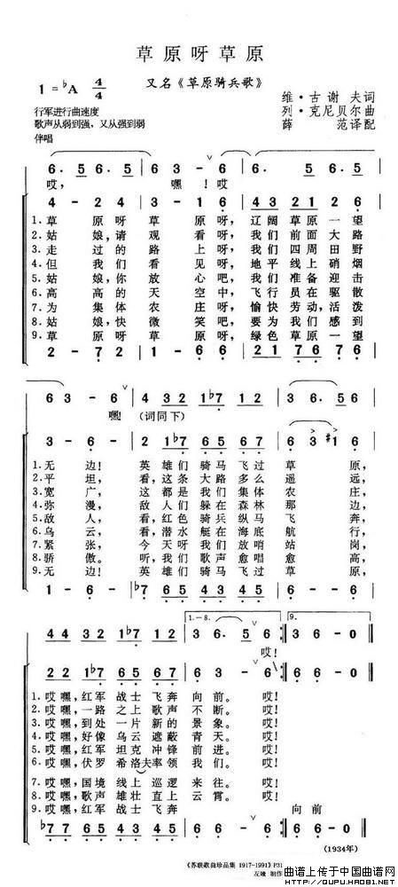 回到《草原骑兵》,这首歌曲原是作曲家克尼贝尔(1898-1974)第四交响曲的终曲合唱。这部标题交响乐曲名为《共青团战士的史诗》。词作者是年轻诗人古谢夫(1909-1944)。他们俩合作的这一作品1934年在苏联共青团歌曲比赛中获奖。不久,国内外许多合唱团和歌唱家开始传唱,尤其是美国黑人歌唱家保尔·罗伯逊的演唱更为成功。著名的美籍英国指挥家黎奥波德·斯托柯夫斯基称赞它是“20世纪最好的歌曲”。