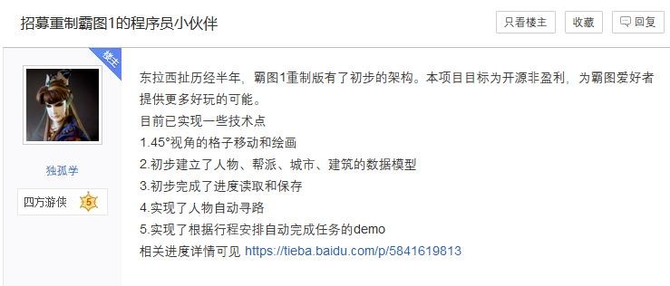甚至有玩家开始从头写一次整个游戏。《天下霸图》吧吧友“独孤学”从2018年开始就在贴吧里直播自己制作“重制版”的过程。