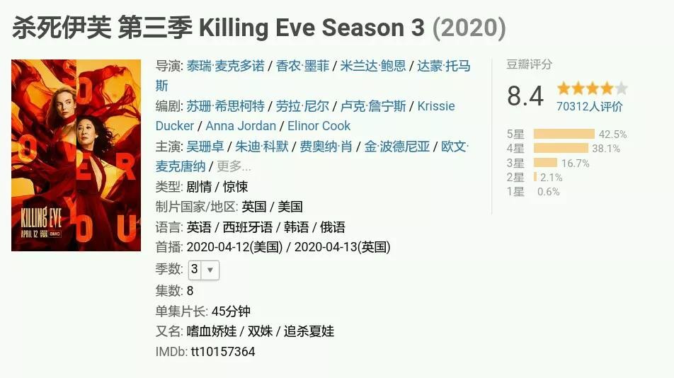 《杀死伊芙》第三季给观众留下了一个暧昧不清的结尾,观众也很好奇杀手和警官这样的奇妙组合最后会是什么样的结局,希望最后一部能给观众答案。