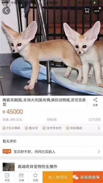 在某知名线上购物平台输入“耳廓狐+动物”等关键词,即搜索到相关店铺,其中一家标出“疯狂动物城芬尼克原型,非洲大耳,45000元”。据该店家介绍,其店内有野生南非进口耳廓狐,大的2万元,小的贵一倍,将近45000元。