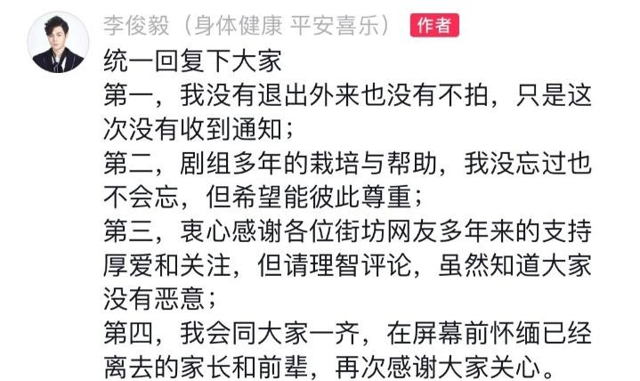 李俊毅发布的声明中,澄清自己没有退出剧组,只是没收到拍摄通知,一句“希望能彼此尊重”似乎证实了他与剧组之间有矛盾的传言。