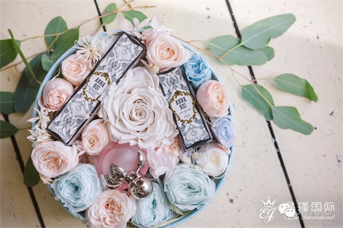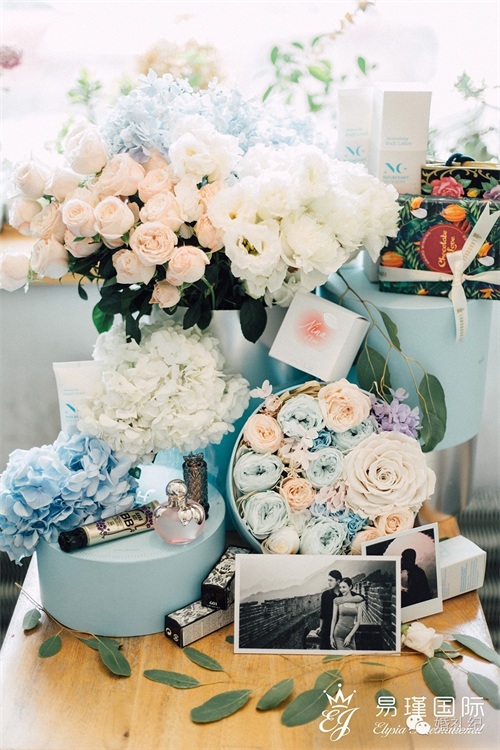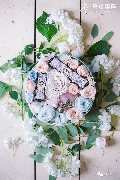 易瑾国际婚礼策划还结合了这些礼品的特点与婚礼主题,定制了粉蓝色圆形礼盒,搭配银色缎带,好梦幻!