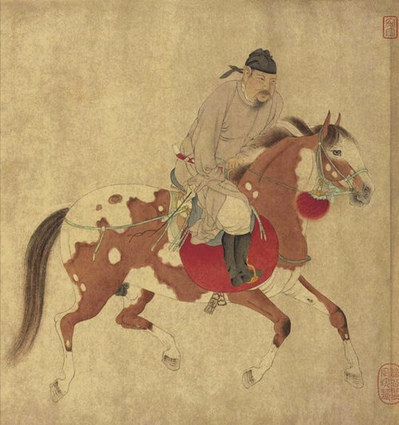 《五王醉归图》是元代画家任仁发绘制的一幅纸本设色画(指用了颜色的国画),描述的是唐玄宗李隆基与他的四个兄弟饮酒醉后骑马归家的场景,画中共有五王和四个随从,共九人九马。唐玄宗李隆基是唐睿宗李旦之子,开元盛世的开创者,史载他与四个兄弟少时感情极好,常一同宴饮,除了李隆基外,另外四王分别是宋王李成器、申王李成义、岐王李范、薛王李业。