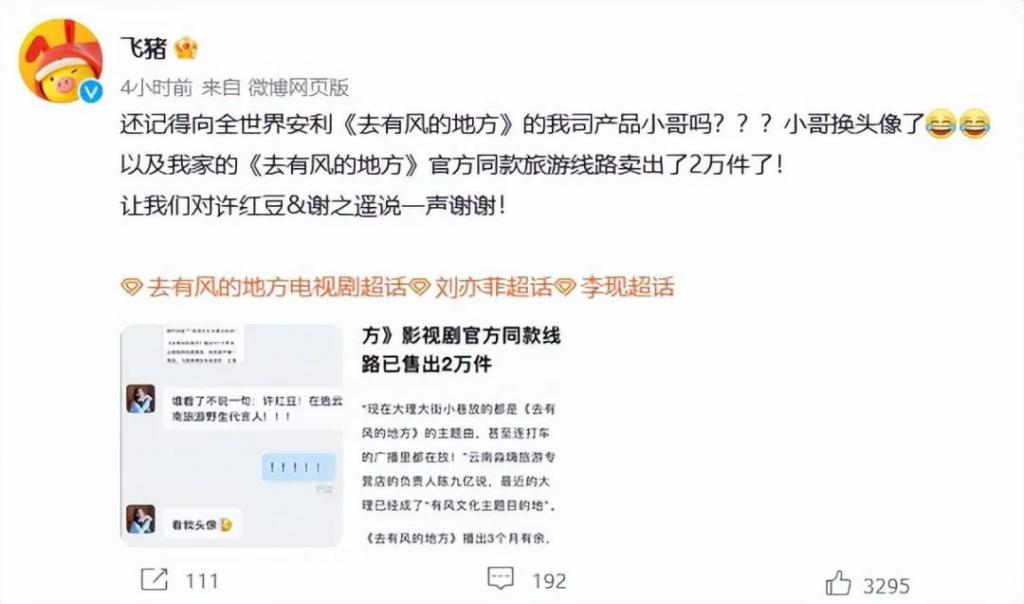 飞猪官博写道:" 还记得向全世界安利《去有风的地方》的我司产品小哥吗???小哥换头像了,以及我家的《去有风的地方》官方同款旅游线路卖出了 2 万件了!让我们对许红豆 & 谢之遥说一声谢谢!"