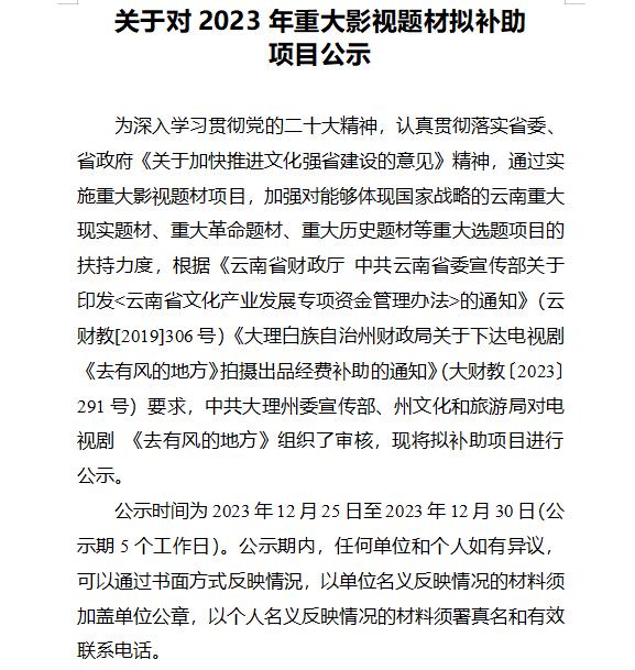 云南大理文旅公示:拟补助电视剧《去有风的地方》200 万元