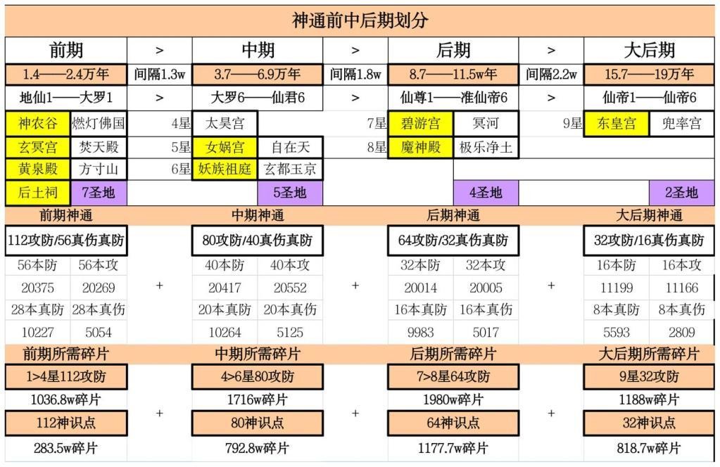从划分中可以看出,前期1.4>2.4万年间大量圣地扎堆,是获取攻防神通,属性提升最快的时间点,因此除攻防神通外,应避免学其他神通。