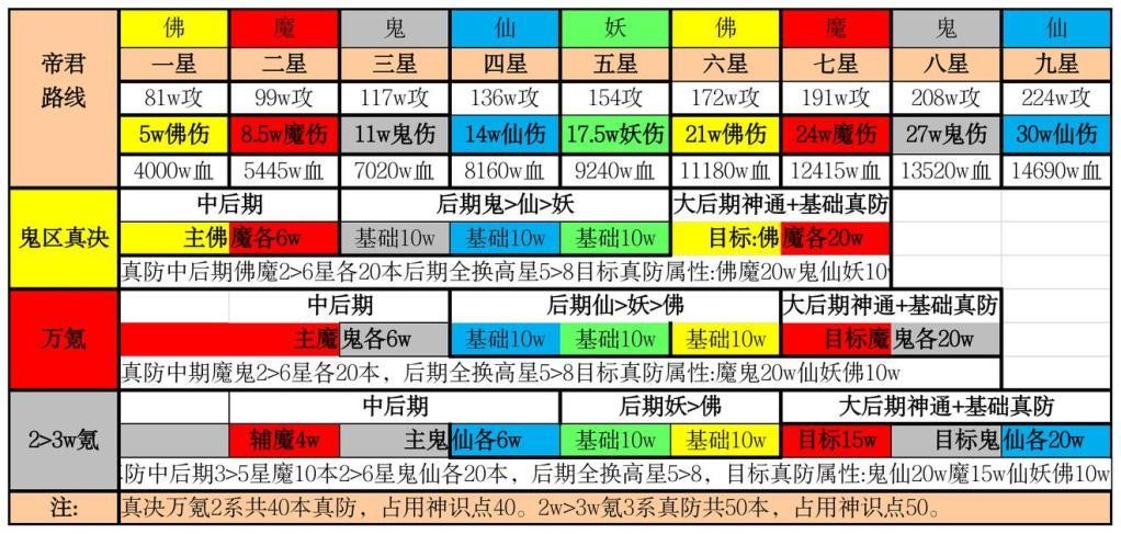 〖万氪〗帝君思路同真决相同。不过万氪主学魔鬼真防,提升基础真防的优先级鬼>仙>妖>佛>魔。在3星鬼帝君时间点,神通真防与自身血量属性不够高,并且鬼帝君锁头,所以要优先提升基础鬼防攻略,4.5.6星帝君依然靠基础真防攻略。7.8星帝君则高星神通真防+基础真防攻略。