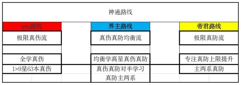 〖3〗神通路线规划。 除了必学的攻防外,对真伤真防的取舍也形成了以下三种路线。三种路线适用范围都不同,盲目学习不可取,选择最适合自己的路线是最重要的。