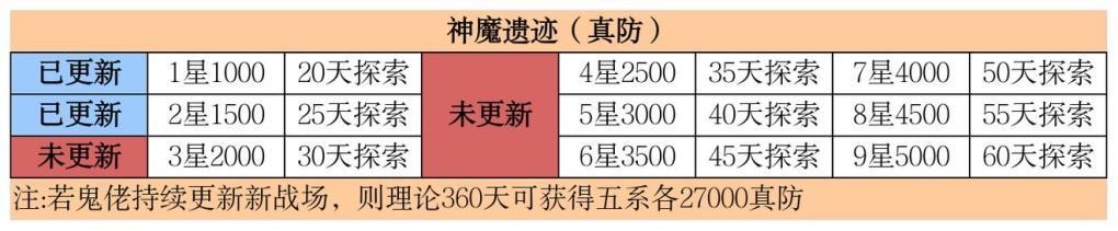 3,鬼佬更新战场缓慢,选择白嫖真防遗迹,缺点白嫖真防与神魔战场进度缓慢。注意事项:神魔遗迹估计四星后属性会很难,需要相应属性,所以表格仅是理论进度,不过大后期才对真防要求很高,所以在攻略氪度范围内,我们遗迹真防获取速度是跟得上真防需求速度的。