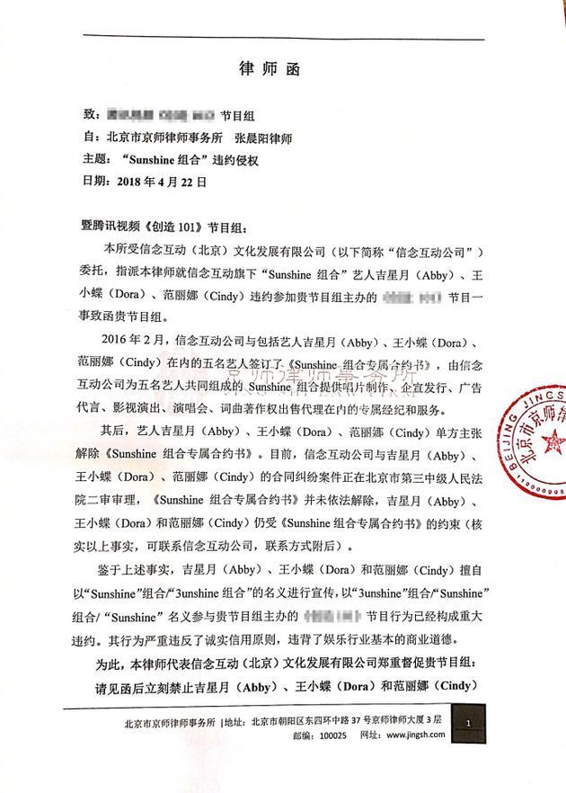 之前3shine素颜出镜《创造101》引来了很多的话题,大家表示竟然有些被圈粉。正在这也许是这三个女生的转机的时候,之前3shine的老东家信念互动跳了出来,发出律师函,称Sunshine组合违约擅自参加选秀节目《创造101》,并督促节目组立刻禁止Abby、Cindy、Dora三人参赛,停止对三人进行宣传。