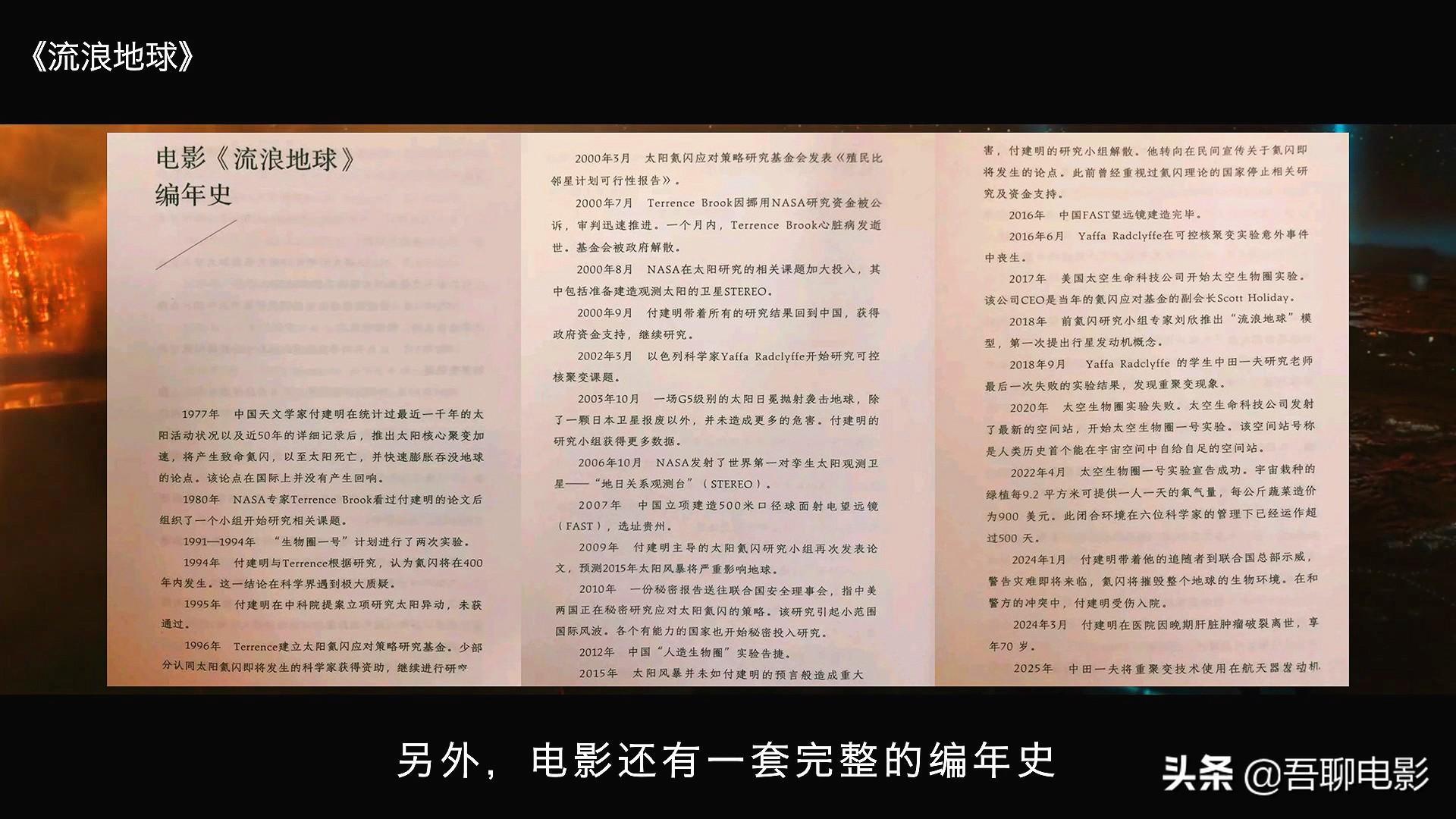 这个和我们之前看过的科幻片完全不同,看电影的时候,很多人感觉中间情节混乱,其实是被删减成这样的,原片貌似有146分钟,另外,电影还有一套完整的编年史,就冲这个,说《流浪地球》是中国科幻的里程碑,一点都不为过,好了,今天的节目就到这里,求个赞转三连吧,感谢收看,我们下期见,拜拜!