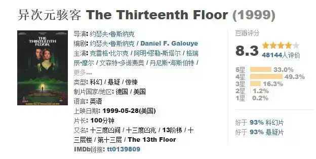 在一栋公共大楼的十三楼,想象力丰富的道格拉斯-霍尔和汉农-富勒将虚拟现实发挥到了极限,他们在计算机上模拟了1937年的洛杉矶.....另类穿越,虚拟与现实之间,分不清的梦中梦,虚拟世界之中的虚拟世界。格局和《盗梦空间》很像。