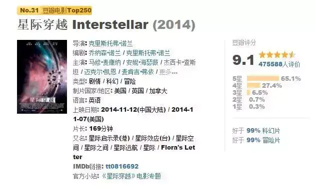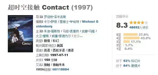 《超时空接触》以一次人类接触地外文明的假定,构筑了情感充沛的科幻奇想,且这种手法与传统好莱坞科幻大片有着很大不同,电影不仅将科学与宗教两者进行了对决,更有着严谨理论“虫洞”的科幻假设,该片改编自天文学家出身的卡尔·萨根的小说,引人思考的内涵,虽然偏重于文艺色彩。 讲的又是从天文观测、地外生命探索一直到虫洞穿越的故事,与其说这是科“幻”,不如说它是一次严谨的科学假设。生命与宇宙的奥义形成了电影的最强科幻,宇宙之广太空之美让人震撼。
