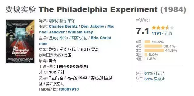 1943年10月,美国海军在费城进行了一次人工强磁场的机密试验,即着名的“费城实验(The Philadelphia Experiment)”,实验成功地将一艘驱逐舰及全体船员投入另一空间。此后,一些船员身上仍留有实验的反应,不论在家里,在街上,在酒吧间或饭店里,都会突然地消失又重现,让旁观者惊讶不已。费城实验的进行具有着深远的意义, 它不仅证实了自然界中的确有我们看不到的另外空间的存在,同时也表明了将人类及装备暂时投入另一空间的可行。