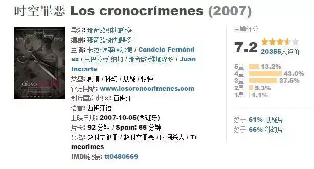 西班牙电影,经典的时空穿越+死循环,男主因为贪色引出的事端,剧情很给力,一步步吸引你,一点点讲完整个故事,不断穿越却又能自圆其说,时间比《恐怖游轮》更早。
