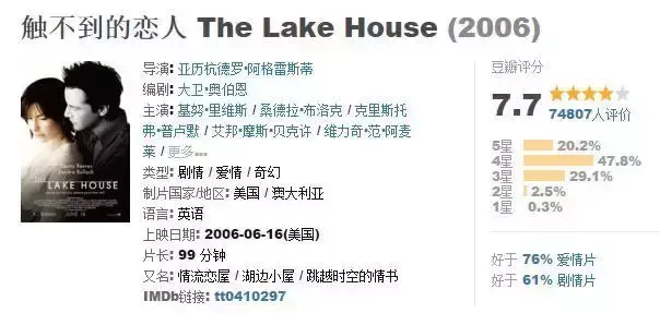 该片主要讲述了生活在不同年代、同一住宅中的女医生凯特·福斯特和建筑师亚力克·维勒之间借奇妙的邮箱书信传情的浪漫故事。美版更注重剧情,特别是男女主角在时间和空间的交错,他们之间关系的微妙变化和演绎显得极为自然,几乎毫无破绽可言,使得平行的故事结构里透着一种张力。
