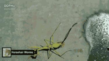 铁线虫是一种典型的寄生体,它们寄生在在一些昆虫体内,比如螳螂,蟋蟀,蟑螂等等,期初这种寄生关系并没有太多的影响宿主。但当铁线虫成长后,便会操控宿主,寻找水源,并最终从宿主体内钻出。