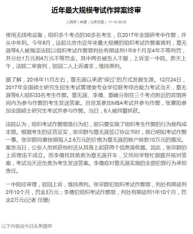今日头条新闻《今年最大规模考试作弊案终审,维持原判》