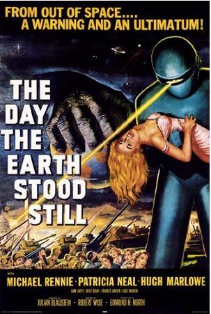 《地球停转之日》是一部1951年的美国科幻电影,根据短篇小说Farewell to the Master改编。一个人形的外星人访客来到地球,带着一个强大的机器人,对人类发出最后通牒。