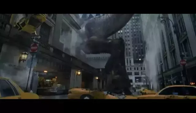10、恐龙找到了鱼堆,并且忘我的享用美食。正在这时,军队发射炮弹,将正在进食的恐龙一下子惊醒了,他们不但没有伤到恐龙,反而让它受了惊吓而逃跑。恐龙在市区里到处乱窜,军队的直升机也相继跟着恐龙不断发射炮弹。于是追逐恐龙瞄准后准备发射导弹。但最终被恐龙躲避,并被摧毁四架直升机。