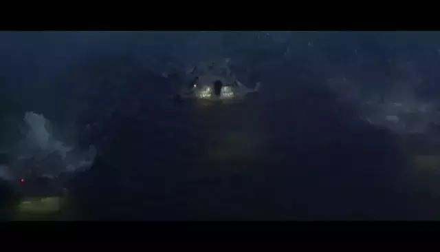 4、夜晚,暴雨依旧在下着。美国东海岸的几艘渔船由于网到了不知名的重物,船速开始慢了下来,但是渔民并不知情,还以为是船长减速了。结果船长并没有减低速度。在看到渔网收不回来之后,船员一片慌乱,眼看船身正被“重物”拖着没入海底。船员纷纷跳入海中。三艘渔船就这样被拖进了海洋,消失在海平面上。