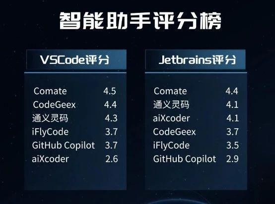 此外,在 VSCode、Jetbrains 等各大插件市场智能助手评分榜中,百度 Comate 分别以 4.5 和 4.4 位列第一,通义灵码位居第二、第三, CodeGeeX、iFlyCode、aiXcoder、GitHub Copilot 等跟随其后。