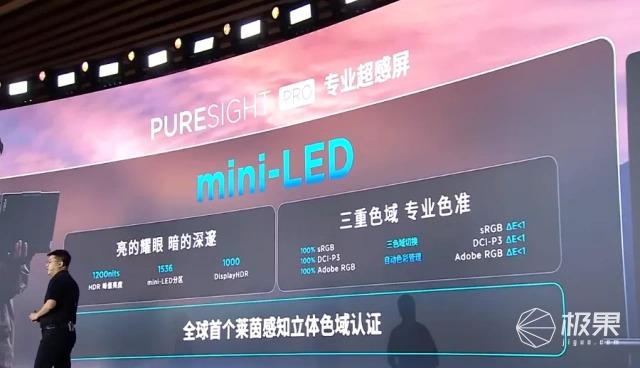 屏幕方面,这是一块 3.2K 165Hz 的 PURESIGHT PRO 超感屏,支持 DCI-P3 与 sRGB 双色域热切换,双色域 DeltaE<1,拥有 600 尼特峰值亮度和 165Hz 刷新率。mini LED 屏幕版本峰值亮度达 1200 尼特,支持 100% sRGB、DCI-P3、RGB 热切换,三色域 DeltaE<1,同时还是首款通过感知立体色域认证的屏幕。