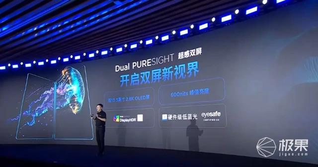 外观设计上,它拥有两块 13.3 英寸的 2.8k OLED 屏幕,能组合出 18 英寸便携大屏,屏幕 400 尼特亮度和 100% DCI-P3 色域覆盖,支持 OGM 触控和触控笔输入。