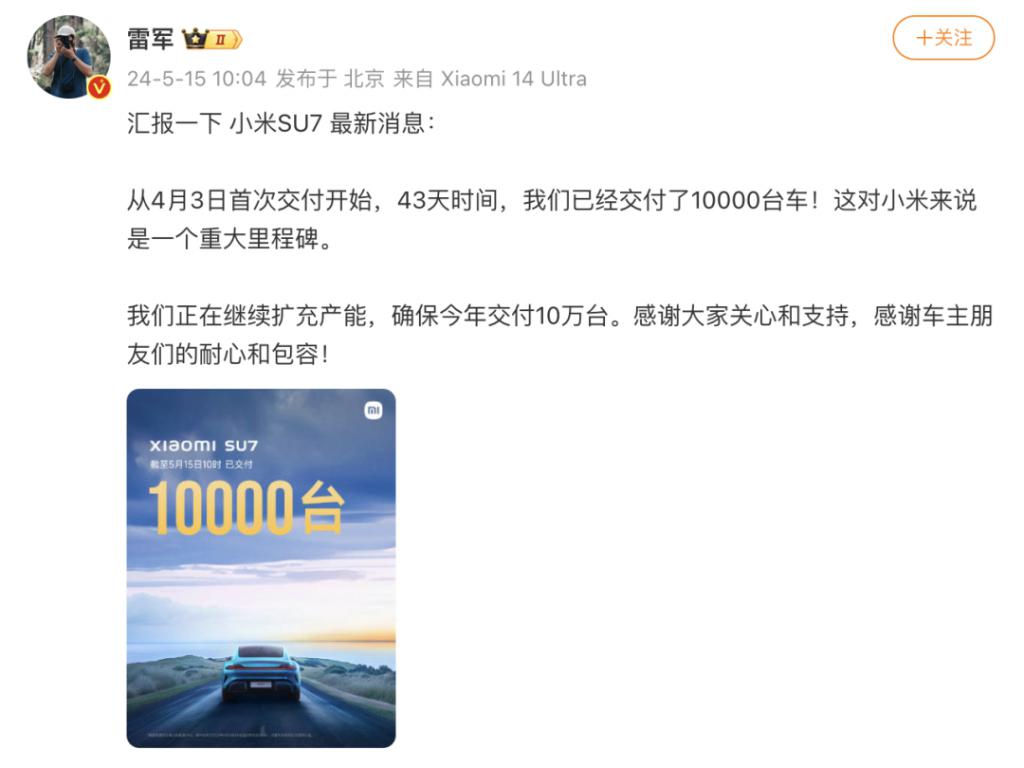 手机帮方面,根据鸿蒙智行数据,4 月份 AITO 问界全系车型销量为 25086 辆;另据小米汽车官方最新披露,自 4 月 3 日开启正式交付以来,截至 5 月 15 日小米汽车已完成交付 10000 辆。